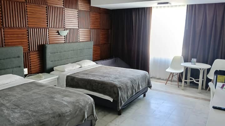 Приватна четворокреветна соба од 350 квадратни стапки на 5-ти кат со 2 лифта. Собата има делумен поглед на морето десно од прозорецот, а лагуната и трговскиот центар лево. Има спална соба со два брачни кревета и единечен кауч на спуштање. На барање, чаршафите, перниците и ќебињата може да се остават за користење на каучот и детското креветче. Има бања со тоалет и туш. Патем, кадата е малку стара и со променета боја, но се чисти совршено пред секое пристигнување.