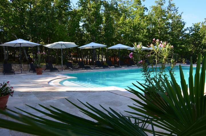 Вгнездени во медитеранска шума во срцето на природната област на Клисурите де ла Сезе (убава зачувана река каде што можете да пливате на 10 минути), го создадовме Domaine во 2006 година, го вложивме целото срце за да ви понудиме прилагодено и човечко добредојде (далеку од стандардите за масовен туризам). Винари и лавандикултури посветени на пристап со висока вредност на животната средина, ние дизајнираме туризам само со најголема почит кон животната средина. Нашите напори беа наградени со етикетите ClefVerte, Qualité Tourisme и Qualité Sud de France повеќе од 10 години. За секој еднонеделен престој, ви нудиме како подарок за добредојде шише вино од нашето производство.