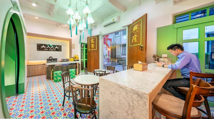 Ние сме организатор на целиот концепт, одлучивме да ја трансформираме оваа елегантна античка куќа во урбан-шик хостел. Со соби за 14 гости, софистицираниот простор е вкусно реновиран со модернизиран изглед кој продолжува да го почитува минатото со елементи од своето колонијално наследство. Тој има за цел да ги задржи оригиналните карактеристики на значајните структури и домашните вибрации на куќата така што ќе им даде само на неколку ентериери модерно преуредување, така што гостите ќе можат да се впуштат во нејзината динамична култура и вредно наследство. Прифаќајќи ги традиционалните детали и современите дизајни, хостелот AMA чува богати, извонредни детали, од кинески четириаголници и сложени заштитни огради до антички паркет и пристојни дрвени прозорци. Шарените нијанси се она што ја оживува старата уметничка околина. Стилски и елегантен, секој кат е украсен со суптилно различни нијанси, инспирирани од расположението и тоновите на четирите сезони. На првиот кат, лобито ја одразува пролетта и зимата во свежо зелено и бело со лушпи од јајца, нудејќи топол и пријатен амбиент откако гостите ќе влезат низ вратата. Има и мало ќоше за оние кои сакаат да уживаат во шолја кафе во релаксирачкото кафуле. Вториот кат го навлекува чувството на летото, со романтична црвена боја која го издигнува просторот со сензуални навестувања. Друга удобност ја вклучува собата за масажа која исто така е поставена на истиот кат.