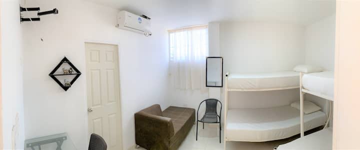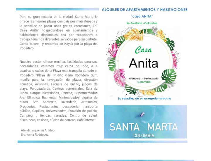 Приватна соба во „Casa Anita“ која се наоѓа на извонредно место во РОДАДЕРО, на вториот кат, со приватна бања, клима-уред, бесплатен безжичен интернет, на 5 минути од плажата Пуерто Гаира, плажата Салгуеро и Родадеро, на 10 и 15 минути од плажата Бланка, плажата Кабо Тортуга, Посос Колорадо, плажата Бело Хоризонте, плажата Дормида, плажата Аеродром, во близина на трговски центри, цркви, рекреативни објекти, ресторани, аптеки, супермаркети и друго. Платена услуга за перење алишта.