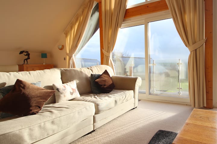 Од семејната соба со отворен план, лизгачките врати водат до голема тераса со надворешен мебел за јадење до 8 седишта. Горе има и балкон со прекрасен поглед кон прекрасните полиња што се тркалаат во непосредна близина на резортот Retallack.