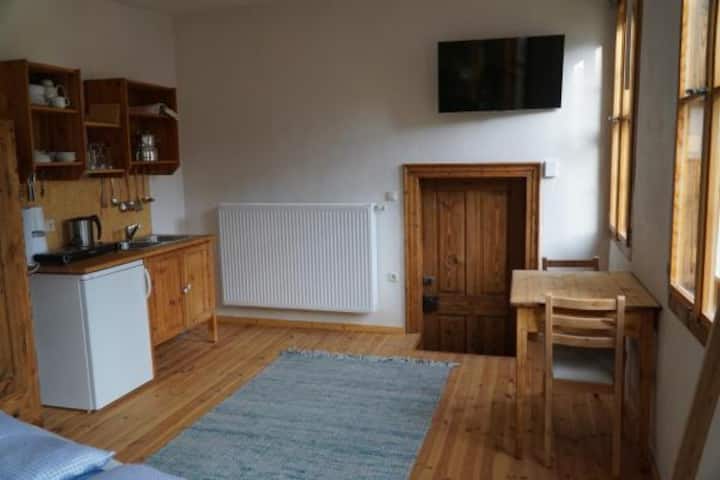 Студио на горен кат, сопствена бања на половина од скалите, сауна