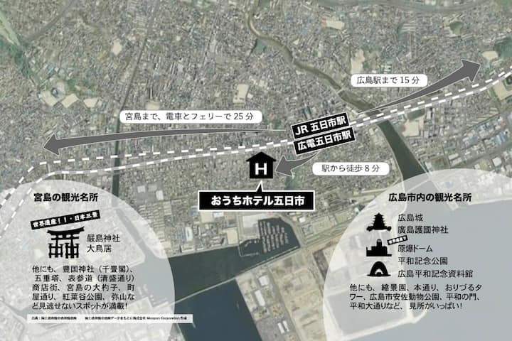 Управувам со неколку имоти во срцето на градот Хирошима со одличен пристап до главните атракции, вклучувајќи ги и локалитетите на светското наследство, куполата на атомската бомба (Меморијалниот парк на мирот) и светилиштето Ицукушима, кое е познато по одличната пловна порта на тории.