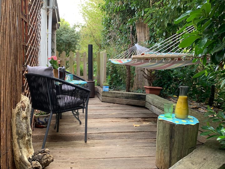 Иако нема пристап до главната градина, имате сопствена веранда и двојна лежалка за на отворено, јадење и опуштање покрај потокот. Дури и ако врне, може да уживате во мирно седиште/оброк покрај ринглата за дрва.