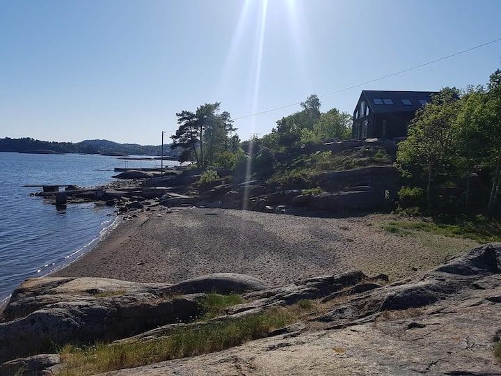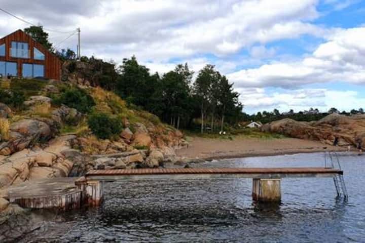 Луксузна голема дрвена колиба/целогодишно живеалиште од 2019 година со приватен пристаниште во зоната на плажата Сандефјорд се изнајмува цела година на одговорни луѓе и фирми. Есента, зимата и нашата ние сме една од неколкуте дрвени колиби/живеалишта прикачени на целогодишната вода на полуостровот. Аеродром, воз и центар на градот Сандефјорд во радиус од 10 минути со автомобил!