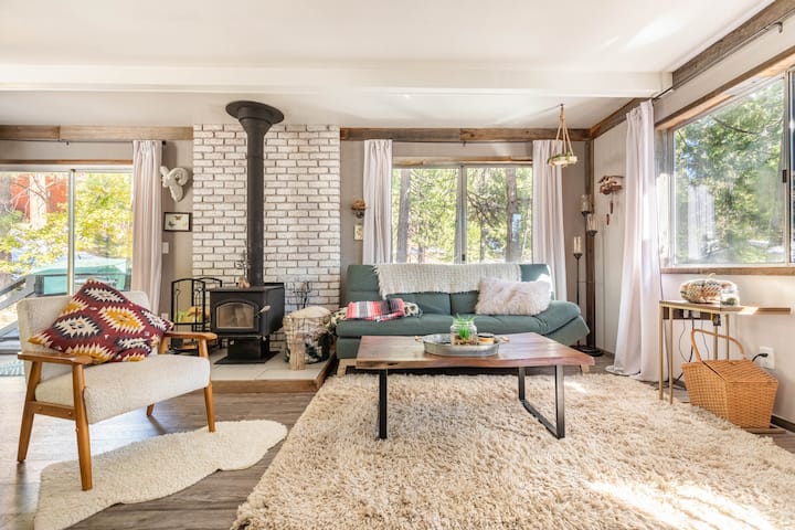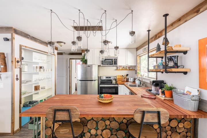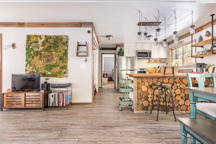 дрвената колиба на врвот на тротоарот во отворен дневен простор со дневна соба/телевизор, кујна и трпезарија со спектакуларен поглед од локацијата на врвот на тротоарот. Мебелот е рустикален/индустриски, но и високотехнолошки со брз интернет, лаптоп и бироа за работни станици во секоја соба, за да можете да работите и да си играте! Телевизорот е опремен со сите канали или со откажување и слушање плочи. Дневната соба, исто така, содржи добро опремена библиотека со книги и игри за целото семејство.