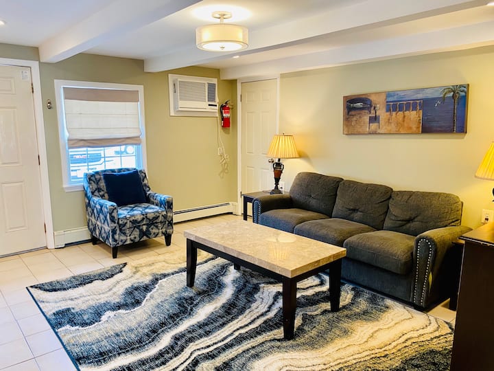 Овој професионално дизајниран, ПРВ кат, апартман со две спални соби (за 4 возрасни лица и 2 деца под 12 години) има отворен план на подот со голема дневна соба со голем паметен телевизор, целосна кујна, вклучувајќи мали апарати, фрижидер во целосна големина, машина за миење садови и микробранова печка. Обезбедени се сите садови за готвење и прибор за јадење. Бања со тоалет со када и туш. Спалната соба има брачен кревет (широк 150-179 см), мебел, голем паметен телевизор и плакарски систем за организација. Дневната соба има брачен кревет (широк 150-179 см). Овој имот има пералница со повеќе машини на само неколку чекори од апартманот. Стандарден WIFI интернет обезбеден преку имотот од FIOS .