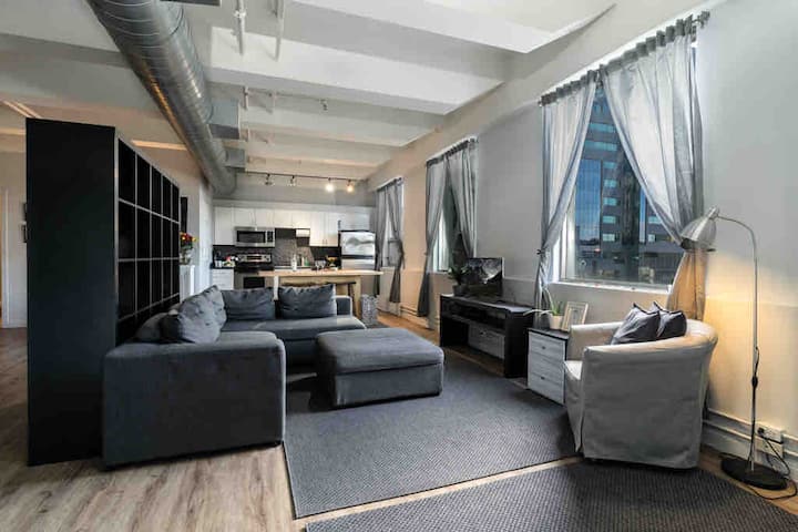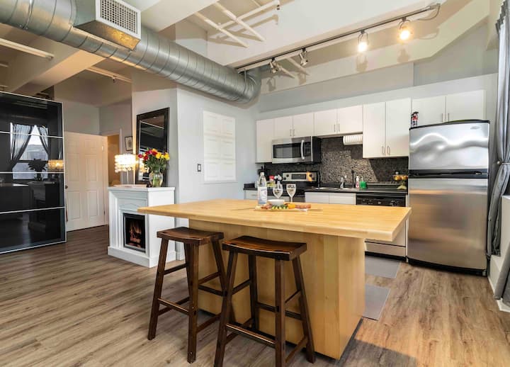 Loft Rental YEG нуди две спални соби, високи тавани, целосно опремена кујна и исклучително чиста атмосфера. Одјавувањето е во 11 ЧАСОТ. Добре дојдовте дома!