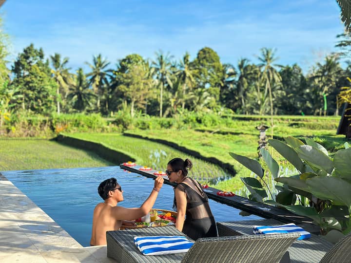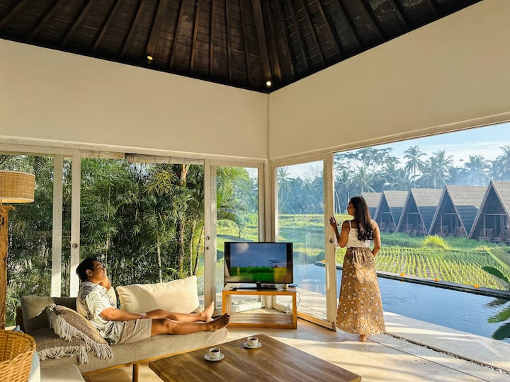 Започнете ги утрата со нурнување во бескрајниот базен, со поглед на широко отворените оризови полиња што го одземаат здивот. Секоја спална соба има сопствена бања со када и топол туш.