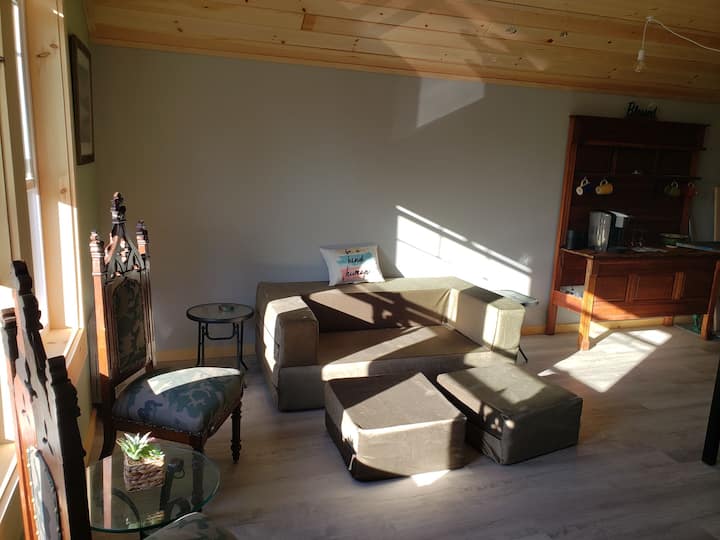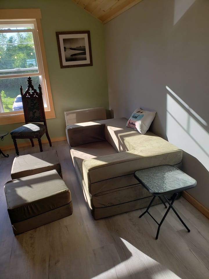 Лејза оаза со пристап до вода и поглед.