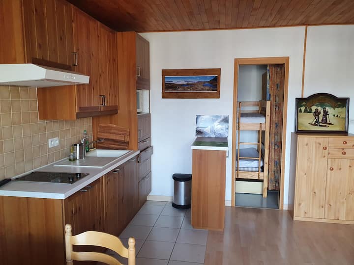 Прекрасен стан со дрвена колиба во студио со поглед кон падините