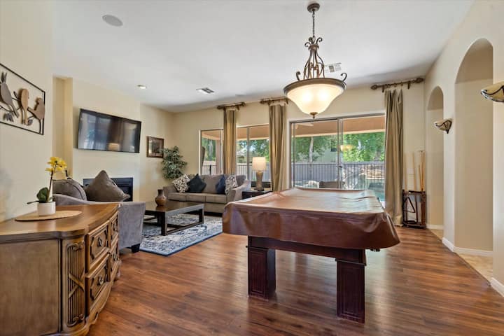 Не барајте понатаму, оваа куќа има сѐ! Просторен дом кој им овозможува на сите да се рашират или да се соберат за малку семејна забава. Има целосен главен апартман на горниот И долниот кат, заедно со капсула од четири дополнителни спални соби скриени на горниот кат, што го прави идеален избор за големи семејни групи кои сакаат да останат заедно под еден покрив. На децата ќе им се допадне базенот со лизгалка од вештачки камен, игралиштето со лулашки, лизгалка и голема сала за вежбање, како и собата за рекреација/игра со Wii конзола и маса за фудбал. За возрасните, масата за билјард заедно со надворешната камина на плин и хидромасажната када ќе ви дадат нови спомени што ќе ги додадете во вашата банка за забавни семејни патувања. И заедно, сите можат да уживаат во филмска вечер на 70-инчниот паметен телевизор во семејната соба!
