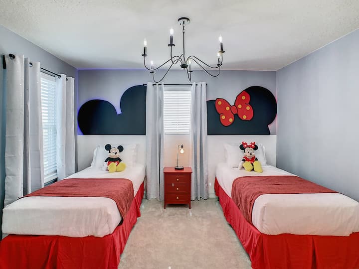 Спална соба 2 (тема на Мики и Мини Маус): 2 единечни кревета - 40-инчен паметен телевизор. (Приватна бања со када и обична када)