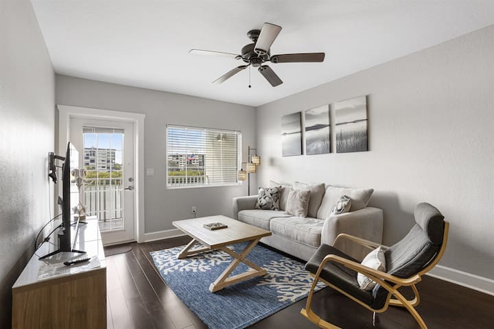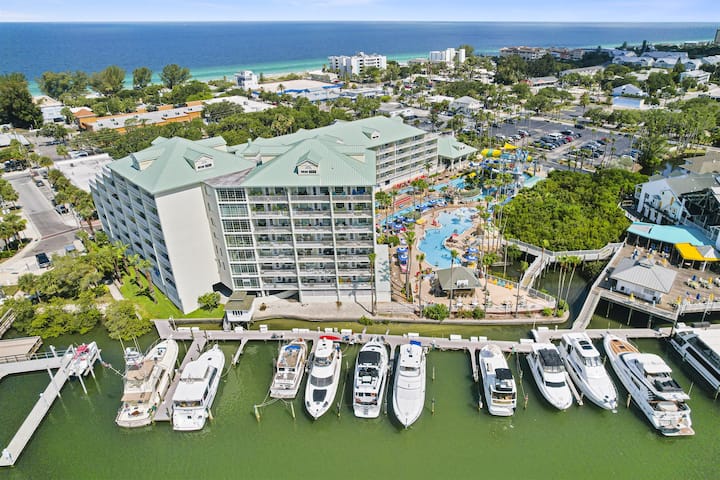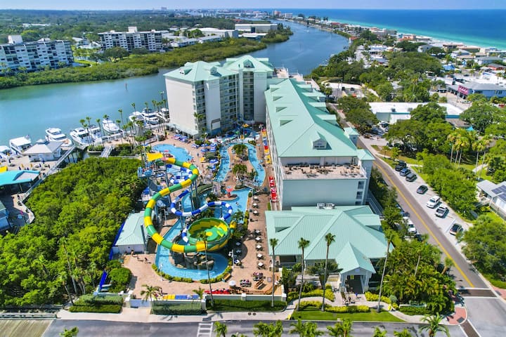 Овој објект со 2 спални соби и 2 бањи се наоѓа на 3-тиот кат во Harbourside на Marker 33, има целосно опремена кујна, машина за перење/сушење алишта, има 2 спални соби, секоја со 2 брачни кревета (за 8 лица) и балкон кој гледа кон внатрешниот брег. Секоја резервација доаѓа со 4 дневни пропусници за воден парк до водниот парк на самото место и една пропусница за паркирање и се наоѓа на 3/5 минути пешачење до плажата. Има многу ресторани во близина, заедно со сместувања за изнајмување велосипеди и бродови. Во секоја резервација се вклучени 4 ДНЕВНИ пропусници за воден парк, заедно со една пропусница за паркирање во гаража. Од 3 до 5 минути пешачење до плажата Индијан Рокс. (2 карти за пропусница за воден парк се еднакви на влез за 4 лица, во секоја картичка може да се сместат 2 лица)