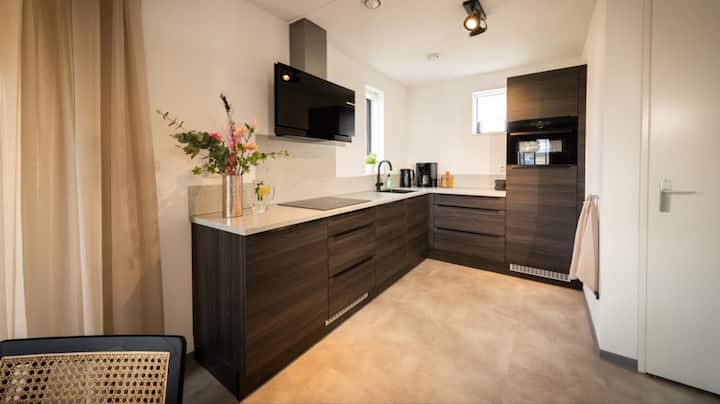 Луксузната отворена кујна е опремена со фрижидер со замрзнувач, индукциона плоча со 4 рингли, машина за кафе со филтер и машина за кафе со капсули, чајник, машина за миење садови и комбинирана печка со микробранова печка.