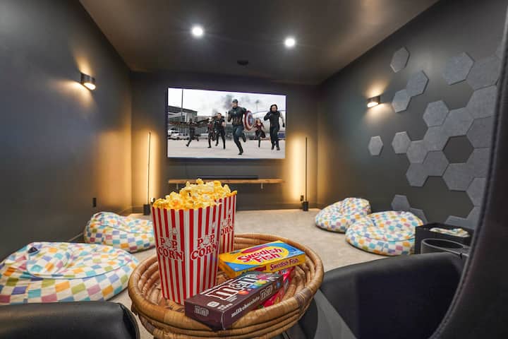 Долу е вашиот приватен театар! Со вистински театарски седишта, осветлување што може да се затемни, одличен звучен систем и забавно обоено LED осветлување до100-инчниот телевизор - може да се сместите во совршена филмска вечер со семејството и пријателите. Не заборавајте да понесете пуканки за да го подобрите доживувањето уште повеќе!