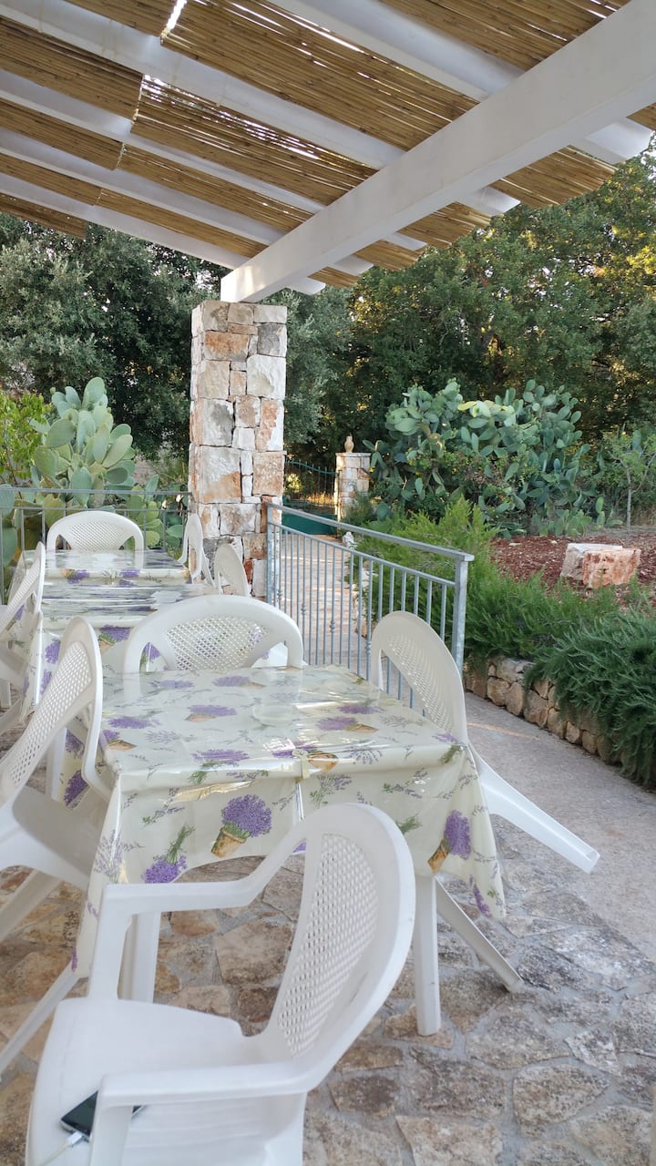 Пансионот со појадок Macchia Mediterranea е идеално место за да поминете пријатен и релаксирачки одмор уживајќи во недопрената природа. Целосно опкружен со типичниот апулиски медитерански скроб кој ја менува бојата со годишните сезони, тој е потопен во тишина и тишина, во стратешка положба во споредба со главните градови на Пулија и на неколку километри од морето. Во пансионот со појадок има и стручно реновиран „Trullo nel Bosco“ кој се наоѓа во медитеранскиот грмушек во центарот на вековните дабови дрвја. Трулото се состои од бања, кујничка, многу пространа трпезарија, со спална соба која се наоѓа во старата штала во внатрешноста на конусот, до која се пристапува преку удобни скали; сите опремени со антички мебел во сиромашна уметност. Целосно достапни простори на отворено за оние кои ќе престојуваат во трулото. Ќе ве пречека вековна маслинова дрва, мирис на ароматични растенија, ќе се будите наутро со чурулигање на птиците и ќе заспивате навечер со шумолење на ветрот што ги гали лисјата.