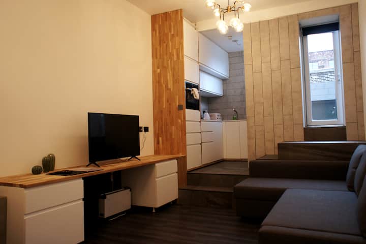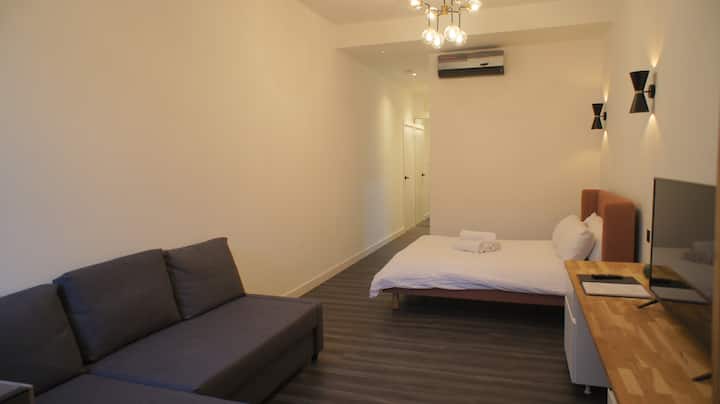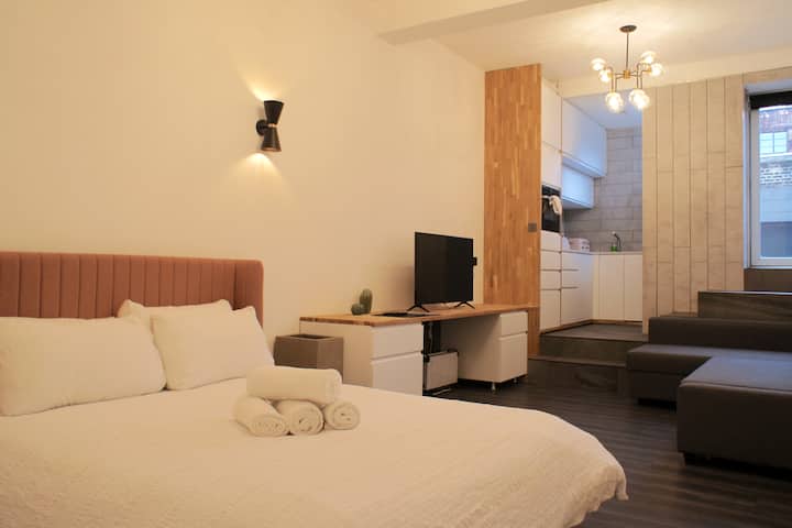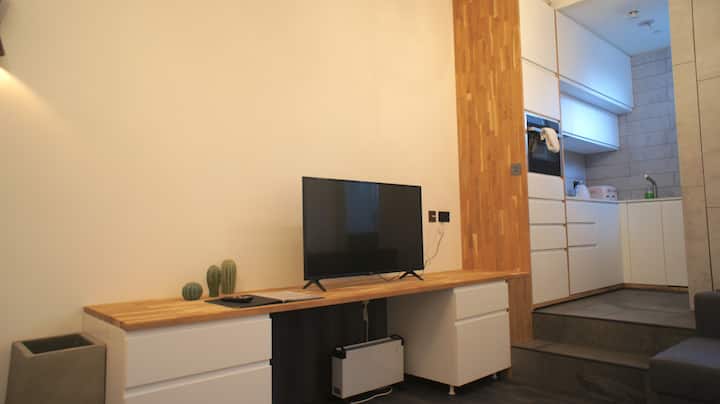 Овој приватен стан во гарсониера содржи кревет, бања, паметен телевизор, бесплатен wifi и целосно функционална кујна која доаѓа со рерна, шпорет, чајник за фрижидер, тостер, тенџериња и тави, стаклен прибор, прибор за јадење и прибор за јадење.
