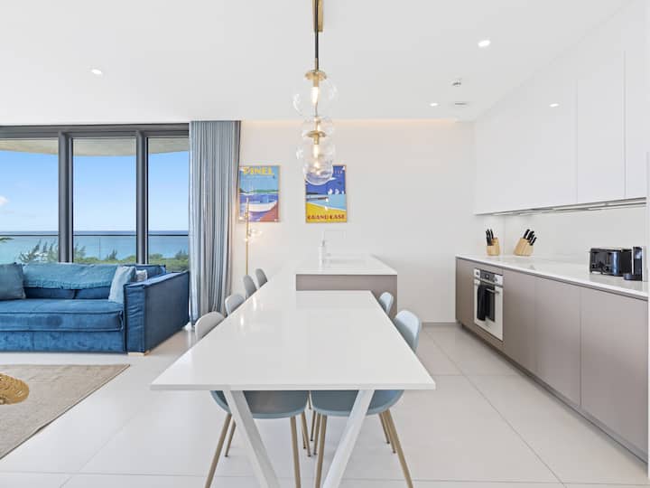 Распоредот со отворен план беспрекорно го поврзува дневниот простор со целосно опремена гурманска кујна, дизајнирана да ги задоволи потребите на најпребирливите готвачи. Одликувајќи се со врвни апарати и елегантни плотови, кујната обезбедува совршен простор за да ја ослободите вашата кулинарска креативност, а истовремено да бидете воодушевени од панорамската глетка на океанот.