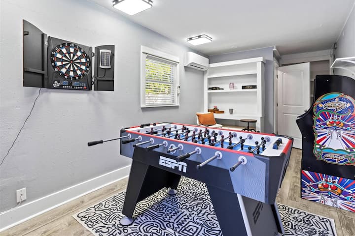 Ќе имате сѐ што ви е потребно за престојот да ви биде удобен како да сте во сопствениот дом. Додека се опуштате во овој реновиран рај, ќе ви се допаднат сите удобности што ви се достапни за да уживате... дружете се со пријателите во собата за игри и играјте фудбалска топка, г-ца Пакман, играјте карти или опуштете се во салонот во предната соба, згответе скара на скара, уживајте во омилениот пијалак на задниот покриен двор или уживајте во кафето на покриениот трем.