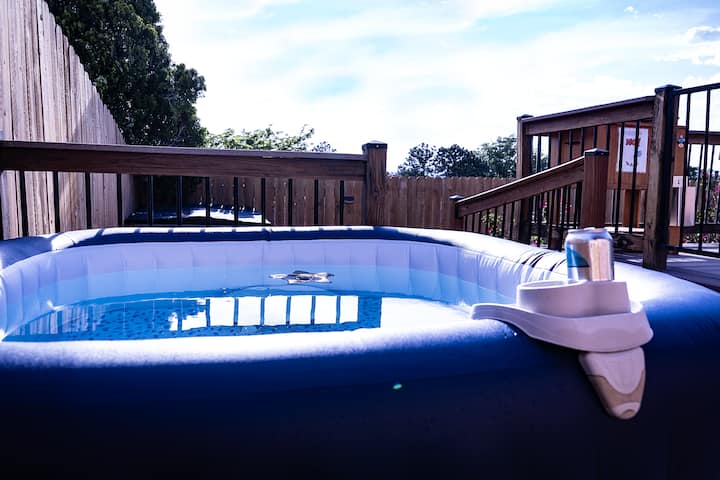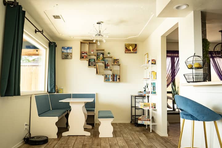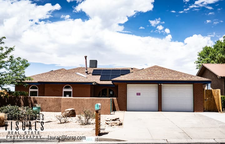 ☀️ Вратете се и опуштете се! Само 2 минути северно од I-40 и 10 минути источно од I-25. 🥾 & 🚴♂️ in the Sandias! Удобен брачен кревет од мемориска пена 🛏️ со 50-инчен телевизор📚, биро и БРЗ wifi 🛜 за работа на далечина во собата! Уживајте во хидромасажната када🛀, 2 огништа🔥, скара, игри во двор⛳️, голф и поплочен двор! Целосно ограден двор погоден за миленичиња, опремен со многу 🐶играчки за кучиња и игри во двор! Многу блиску до Sandia Foothills - 5 минути пешачење до Бакар Трејлхед кој 🌵 го одзема здивот, погледот на планините 🏔️ и градот!