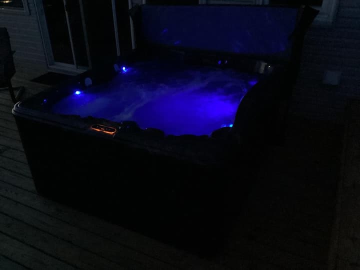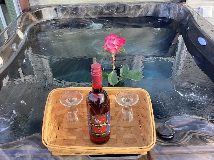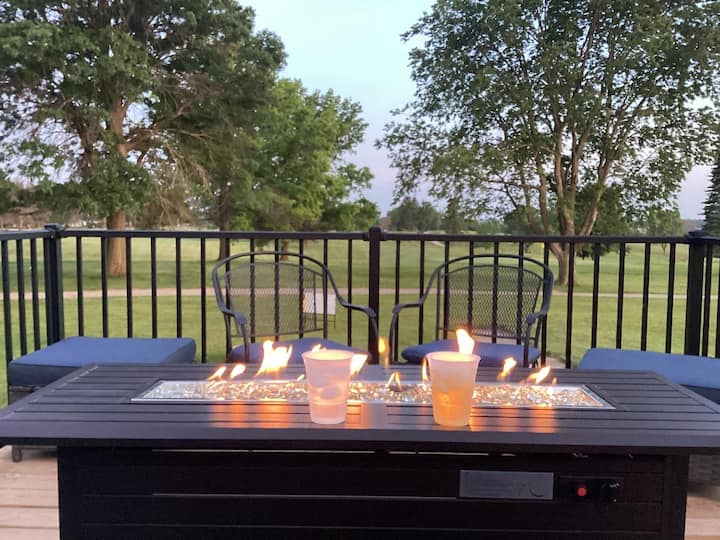 Уживајте во погледот на теренот за голф со хидромасажна када и огниште.