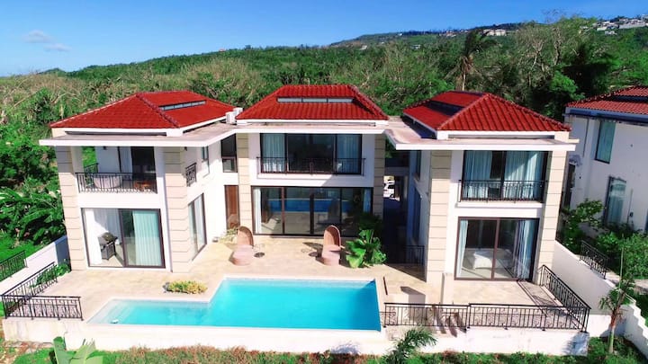 Дворот на Сината планина се наоѓа во најзлатната област на островот Сајпан и е најновата вила на островот во моментов.Вилата е изградена на половина планина од поморски ридови со одличен поглед на океанот, со панорамски поглед на островот на воените бродови и целиот западен брег.Вилата, исто така, одржува удобно растојание од соседството, каде што можете да уживате во погледот и приватноста на вашиот одмор.Во подножјето на планината се наоѓа познатиот 5-ѕвезден хотел Hyatt Regency Saipan и супермаркет кој го угости најинтензивното централно комерцијално соседство.Најблиското крајбрежје е плажата Мек во седум бои на брегот на океанот, а Американскиот меморијален парк се протега на десетици хектари на работ на плажата.