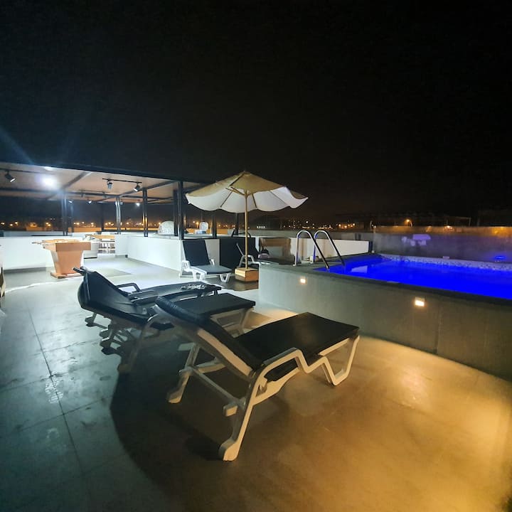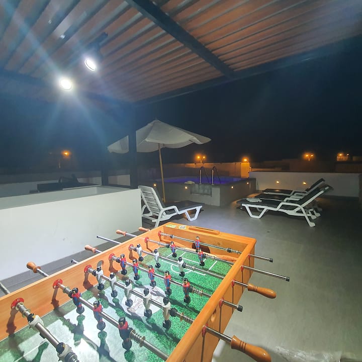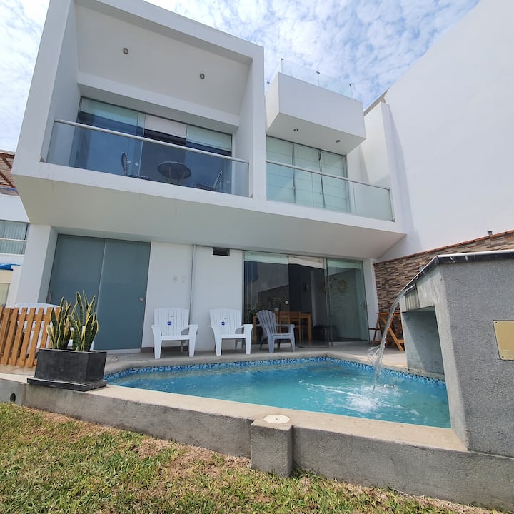 Прекрасна куќа со приватни базени со лед светла, скара со кинеска кутија. Тераса со сонце и сенка. Маса и маса , занаетчиска земјена рерна, 6 соби со одделни бањи, 1 бања во посета на бања, дневна соба со 65'телевизор со Nexflix, Disney, Prime, Start+, Cable Go. Простор во бар. Дневна соба со телевизор 55',маса за домашна канцеларија со интернет оптички влакна .3 паркинг. Јавен семеен домен погоден за миленичиња (ограничувањата се сметаат за опасни)•Директен пристап до плажата.