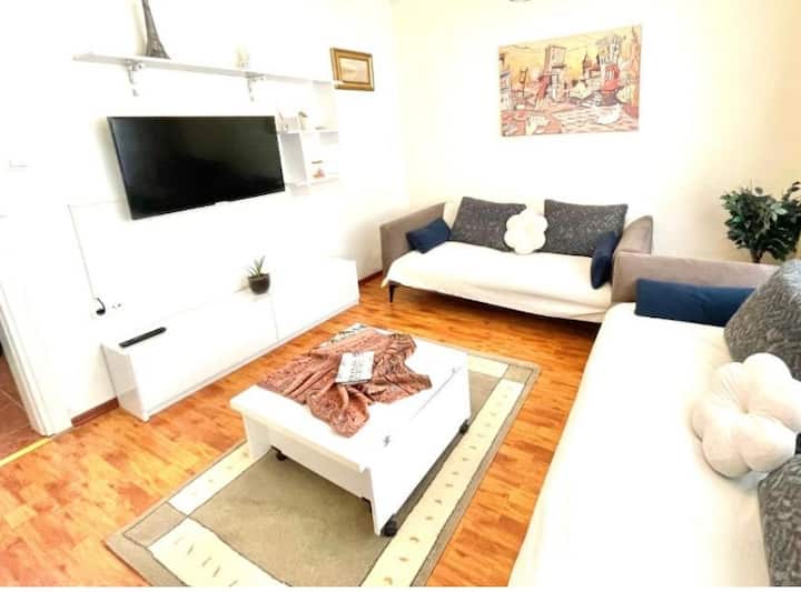 Здраво... Куќата е топла и удобна... Тоа е прекрасна куќа со двојна тераса во центарот на градот.