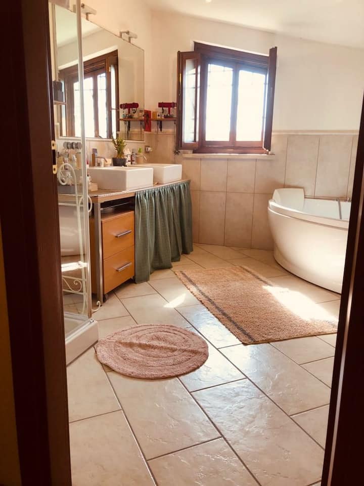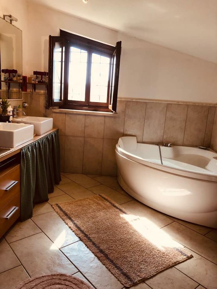спална соба со тераса, бања со хидромасажна када