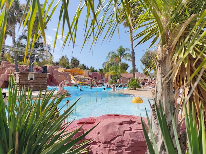 Престојувајте ВО УДОБЕН мобилен дом за 6/8 лица од 33 м2, климатизиран со телевизор, сместување со 3 спални соби, во нашиот камп Тикајан во Јер, на 300 м од плажата. Нашиот Camping les Palmiers нуди воден парк од 850 м2 со лизгалки, еден од базените од 90 м2 се грее, за да уживате во пливањето од април до октомври. Ресторан, продавница и капка леб, сауна, детски игри, пинг-понг, тениско игралиште и топки.