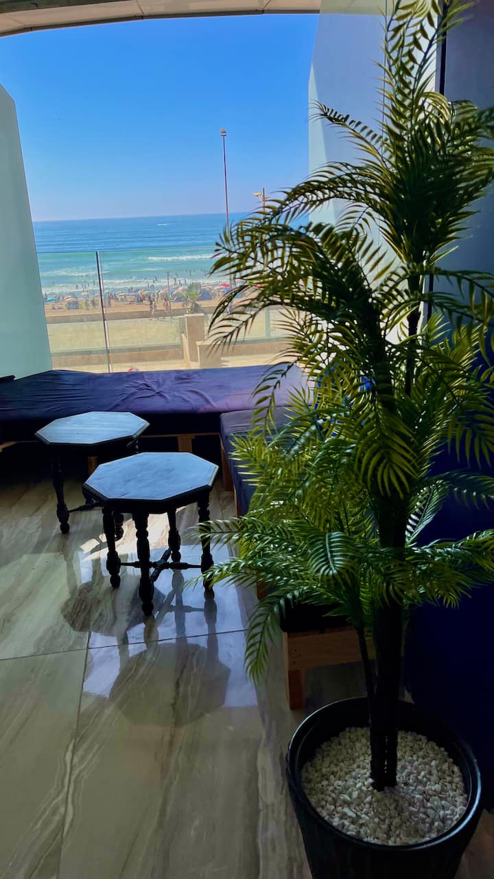 Стан на плажа со поглед кон океан и зајдисонце.