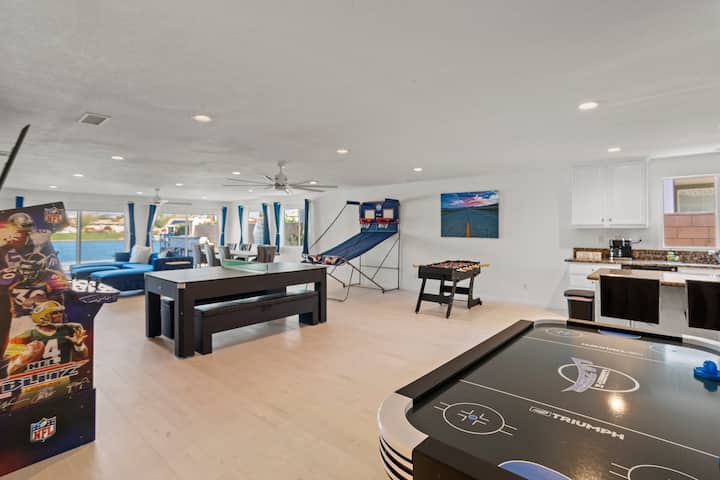 65-инчен паметен телевизор, маси за базен и пинг-понг, 4 аркадни игри, хокеј на воздух и кошарка 2 Pop-Shot.