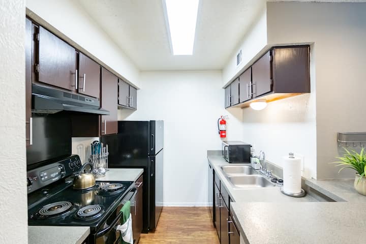 Обезбедуваме прифатливи, целосно опремени домови за професионалци кои патуваат. Секоја единица е внимателно опремена со сѐ што ви е потребно за удобен престој, вклучувајќи опремена кујна, брз wifi, брачен кревет (широк 180-220 см), паметен телевизор и влез без клуч за погодност и безбедност.