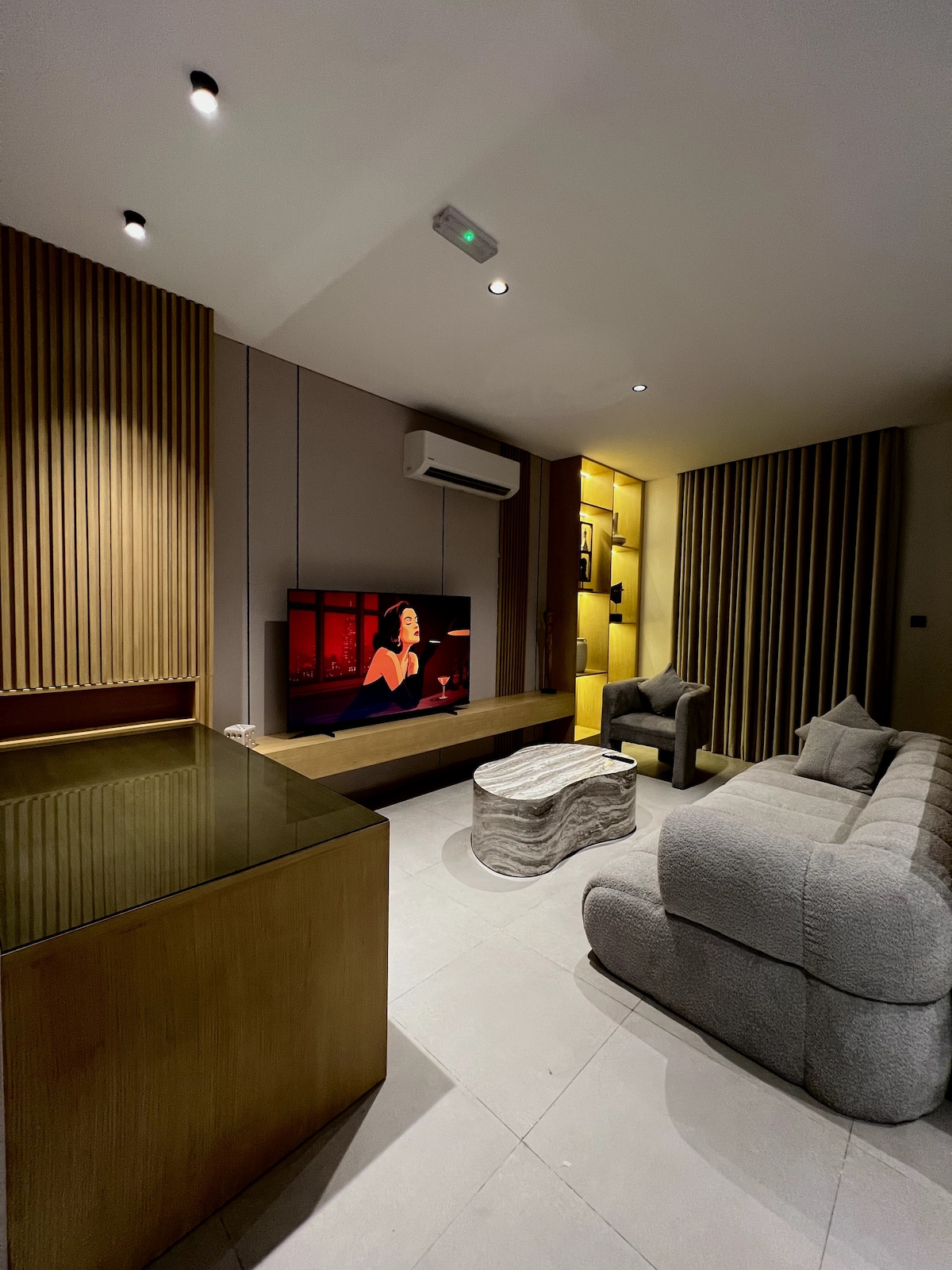 Овој модерен стилски еднособен стан е идеално лоциран на Мускат Ал Муж, со поглед на море и базен кој го одзема здивот. -- Просторот... Тивко, чисто и мирно со нов и модерен мебел што го прави совршен за опуштање и уживање. Базени, сала за вежбање, простор за играње за деца, пристап до плажа, пристаниште, кафулиња и убави ресторани во и на отворено во регионот. Опуштете се целосно со врвни удобности (75-инчен телевизор, брз wifi, постелнина и крпи со хотелски квалитет,кафе) на вашите прсти!