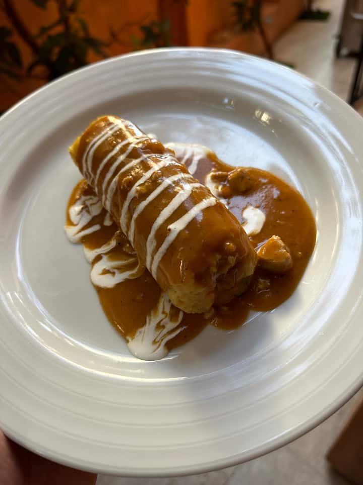 Главно јадење: пилешки тенга флаути со чипотле ранч, мајакоба грав, мексикански ориз