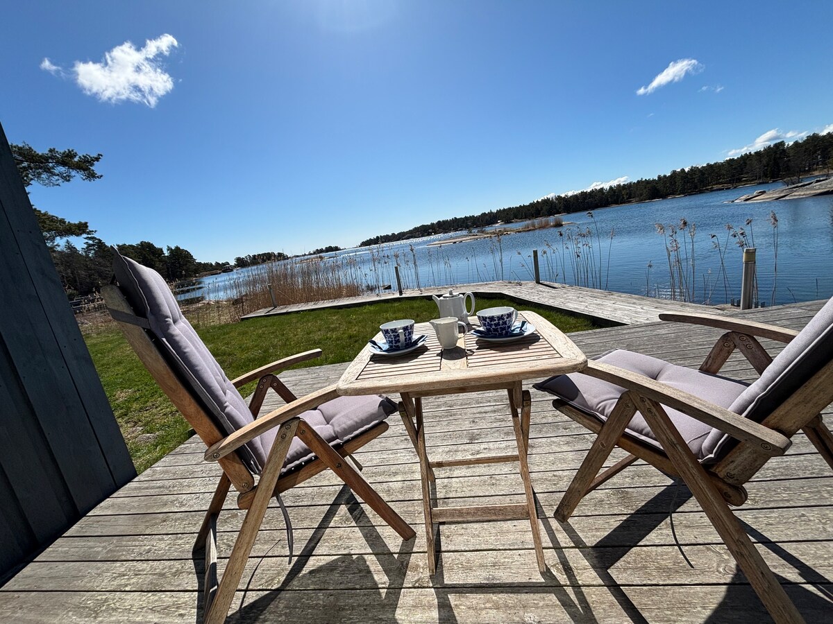 Идилична куќа на архипелагот со голема дрвена тераса со поглед кон езерото. Заеднички пристаниште за сончање / капење. Камин во куќата и голема градина. Можност за многу активности во слободното време во текот на целата година. Има игралиште за куб, бадминтон. Чистењето го врши гостинот. /Анг: Идилична куќа на архипелагот за посета во сите сезони. Голема тераса покрај куќата кон морето. Заеднички пристаниште/кеј за пливање/капење. Камин во куќата. Голема тревник за релаксација. Чистењето го врши гостинот. (Во куќата има некои приватни предмети)