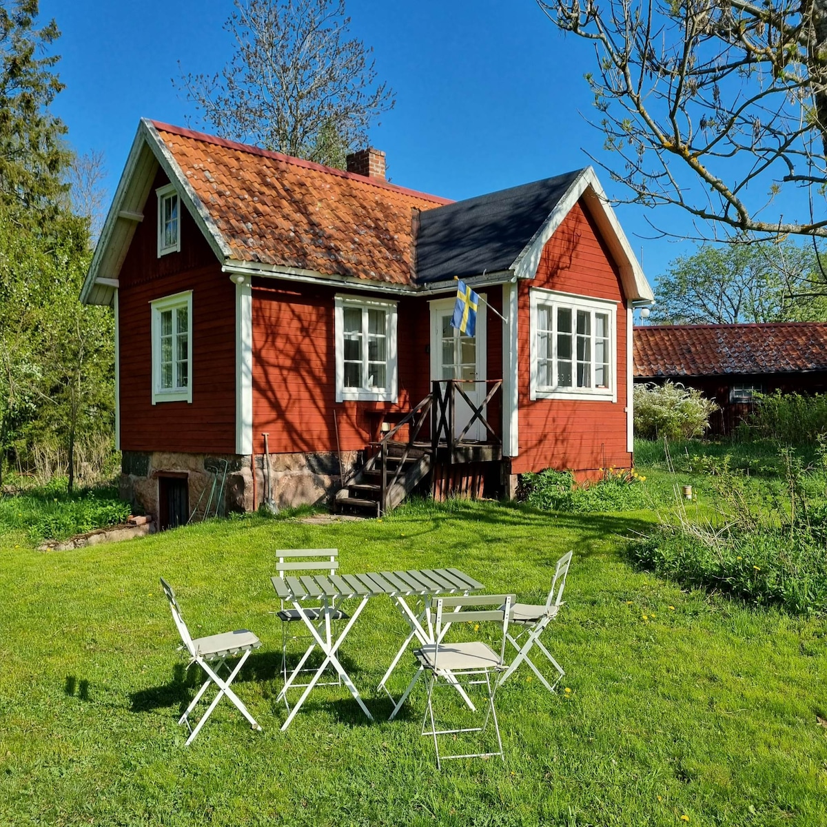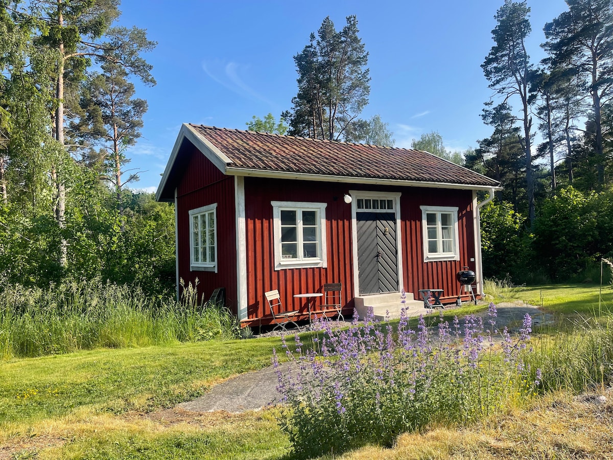 Опуштете се во оваа убава и шармантна куќа. На околу 400 м до морскиот залив и мал простор за пливање. Овде ја сакате природата, ја сакате природата,шетањето и само да бидете . Во лето, во изолираниот поплочен двор има скара и надворешен мебел. Rowboat е достапен за позајмување за еден ден на барање. Има 120 кревета и завеса на кауч на спуштање за спалната соба. Забрането пушење ,без миленичиња поради алергии. Чаршафите и крпите не се вклучени, но може да се додадат за 150:-pp Куќата е блиску до главната куќа каде што живееме трајно .