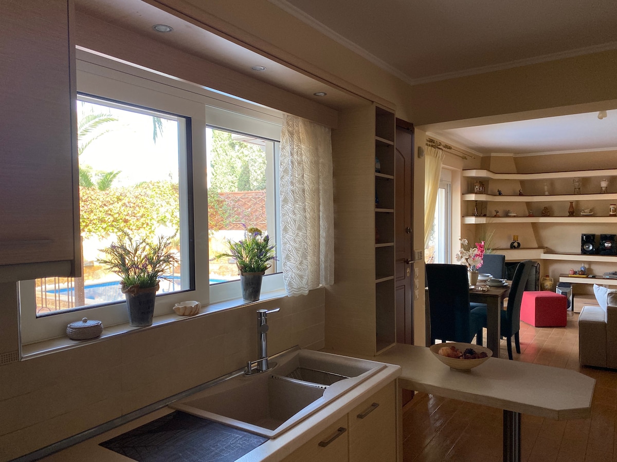 Пространа куќа во која може да се сместат едно или две семејства, со голема градина во многу пријателско и мирно соседство. Нема сообраќај и паркирањето надвор од имотот никогаш не е проблем. Имотот се наоѓа во тивка станбена област, но на само 5 минути пешачење (600 метри) може да се биде на плажа (Varkiza Resort) или продавници за потребните материјали. Може да изберете дали да поминете една ноќ во бар или ресторан покрај море или тивка вечер под црниците.
