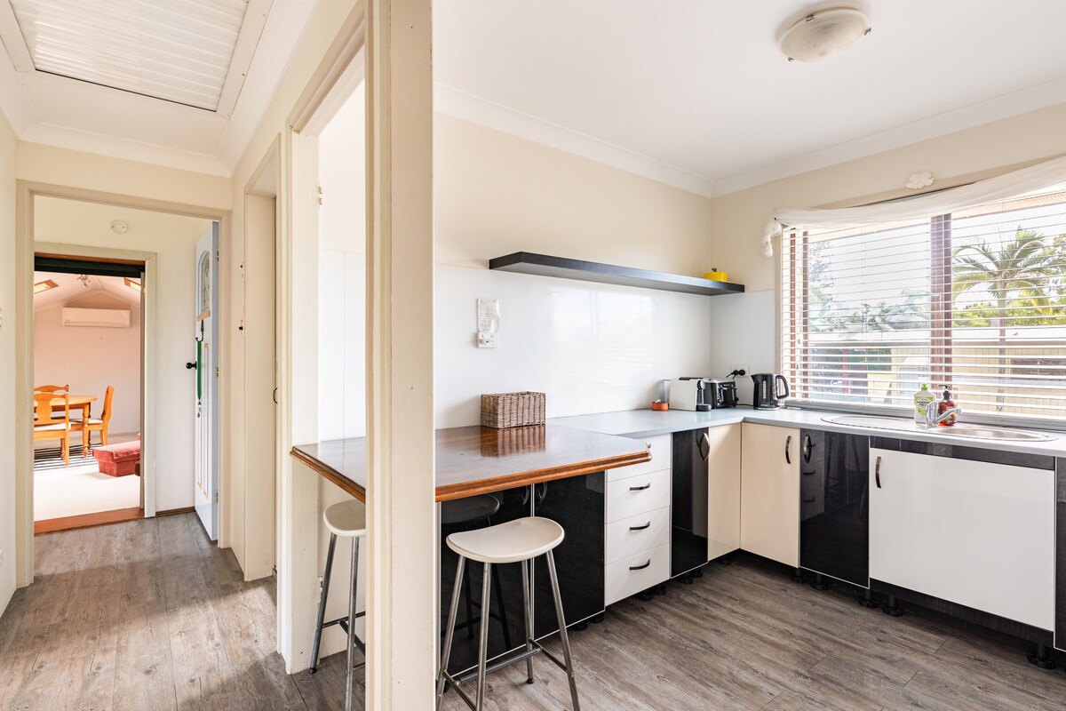 Одморете се и одморете се во оваа мирна оаза. Меј е еден од двата целосно самостојни стана во рамките на оваа зграда. Секој стан има сопствен влез и може да уживате во ексклузивната надворешна камена бања, да се опуштите пред внатрешниот камин, да се гушкате на брачниот кревет или да ја искористите во висечката лежалка. Овој прекрасен имот со грмушки има пристап до заливот Мортон, кој е на 10 минути возење од плажите на Стради и на 15 минути од езерото Браун. Ќе се чувствувате како да сте во друг свет.